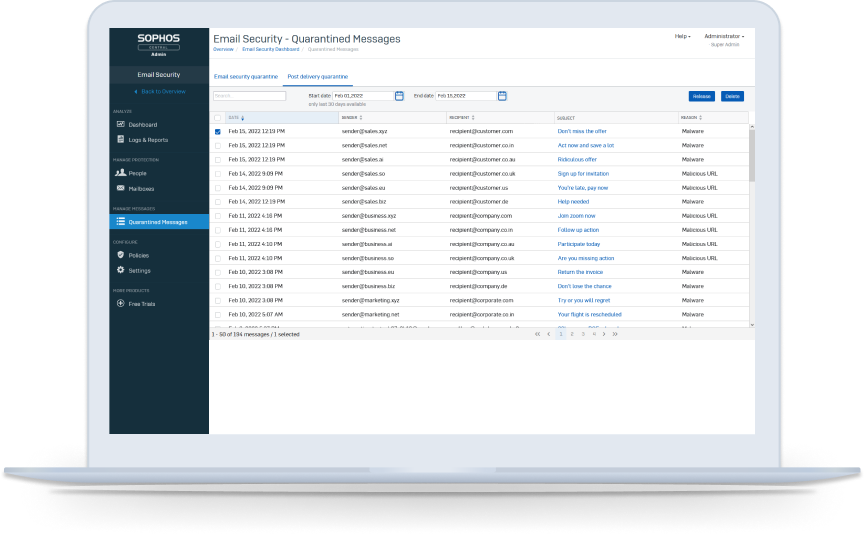 Sophos multi-layered protection uses threat intelligence, reputational and behavioral analysis, and state-of-the-art machine learning to eliminate malware and malicious URLs before they reach the inbox.
